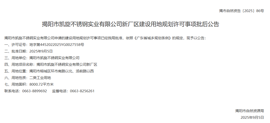 2025年9月5日,揭陽市凱旋不銹鋼實業有限公司新廠區建設用地規劃許可事項批后公告。(來源:揭陽市自然資源局)聲明:以上內容轉載自51不銹鋼網,如有侵權請告知刪除。
