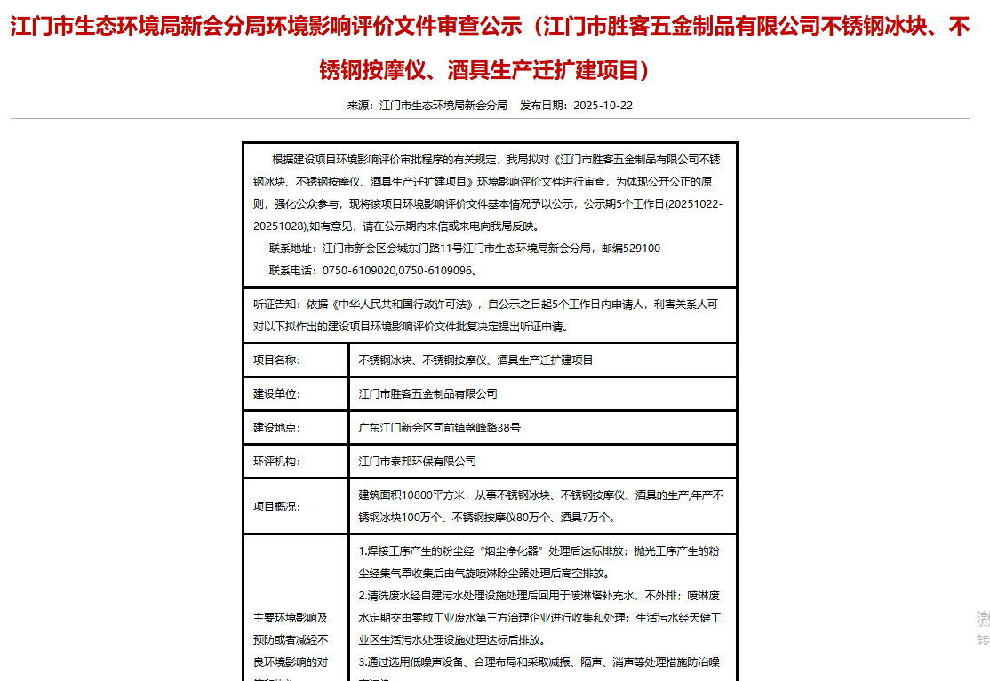 2025年10月22日,江門市生態環境局新會分局就江門市勝客五金制品有限公司不銹鋼冰塊、不銹鋼按 摩儀、酒具生產遷擴建項目環境影響評價文件進行審查公示,公示期:5個工作日。(來源:江門市生態環境局新會分局)聲明:以上內容轉載自51不銹鋼網,如有侵權請告知刪除。